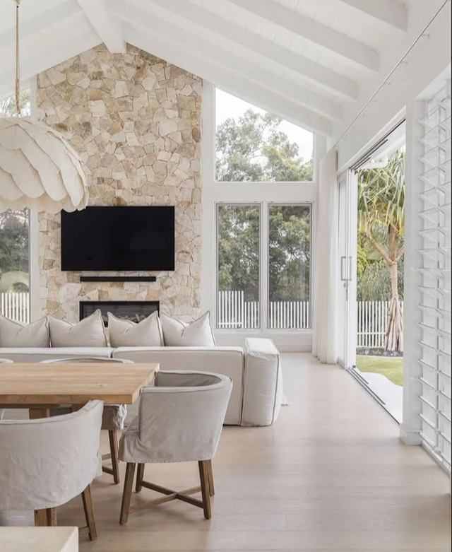 This breezy living-dining combo captures coastal elegance with its neutral palette, open layout, and stunning stone fireplace.