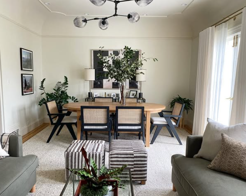 Textural elements—like cane-back chairs, leafy plants, and striped ottomans—bring in movement and character, while neutral tones keep everything cohesive.