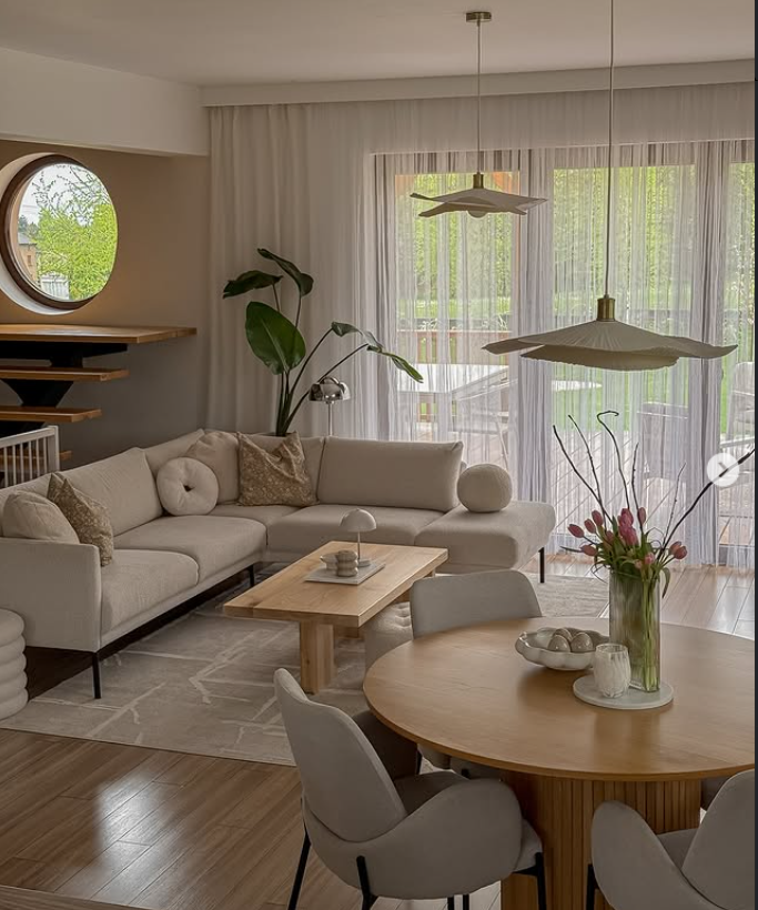 This space perfectly balances modern style and cozy function, with a warm wooden dining table anchoring the room and plush seating areas layered throughout.