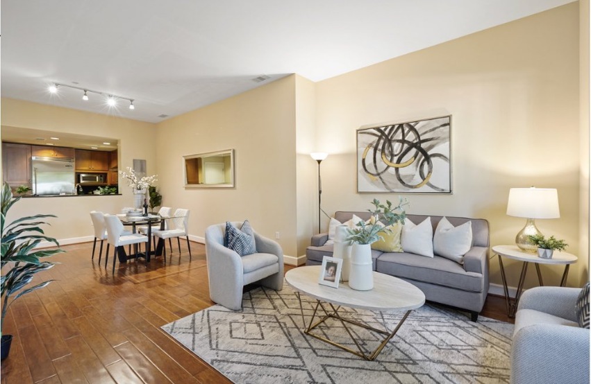 The open sightline to the kitchen maximizes flow, and neutral tones tie everything together, making it an ideal setup for entertaining or everyday lounging in a compact home.