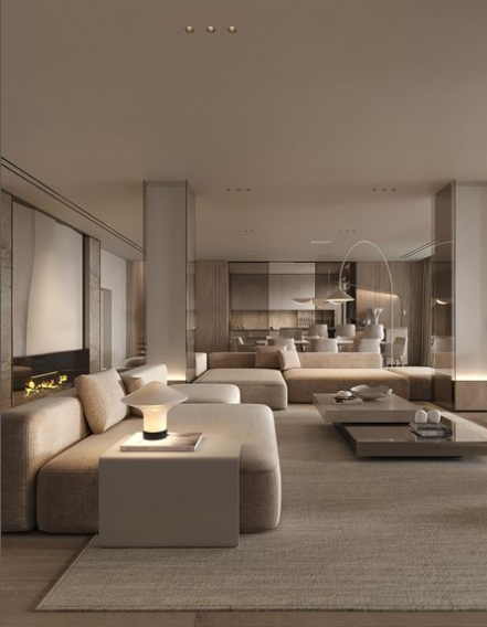 The living area features a plush, neutral-toned sofa and elegant coffee tables, creating a cozy lounge space. Subtle wall detailing and ambient lighting add a refined touch.