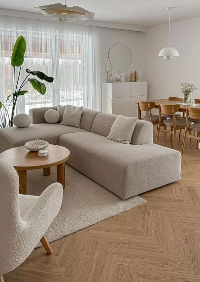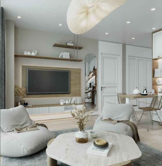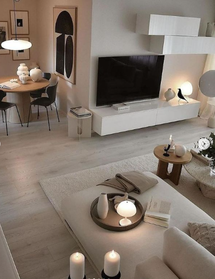 This cozy and modern living-dining combo brings a touch of Scandinavian simplicity with its soft, neutral tones and minimalist decor.