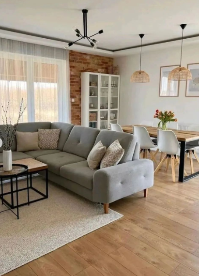 This stylish living and dining combo balances functionality with a touch of rustic charm.