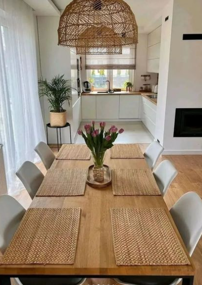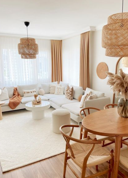 In the dining area, a round wooden table with matching chairs ties into the natural theme, while woven pendant lights and dried floral arrangements bring in a bohemian touch.