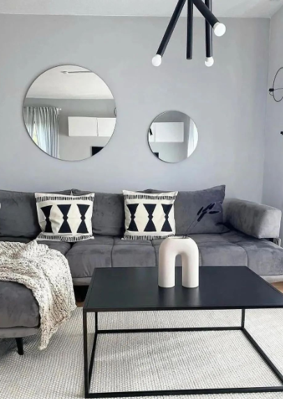 The living area features a plush gray sectional adorned with bold geometric pillows and a striking black coffee table, while round mirrors add depth and a touch of elegance.