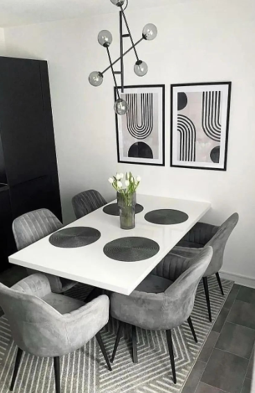 In the dining space, a glossy white table paired with soft gray chairs complements the theme, enhanced by abstract wall art and a unique chandelier.