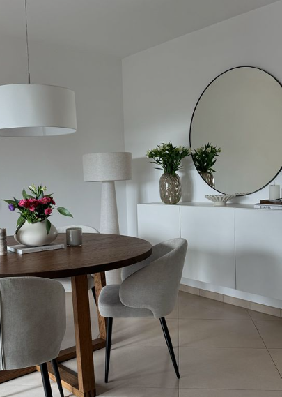 A round wooden table paired with soft, upholstered chairs creates a cozy, intimate setting, while a large round mirror on the wall adds depth and visual interest.
