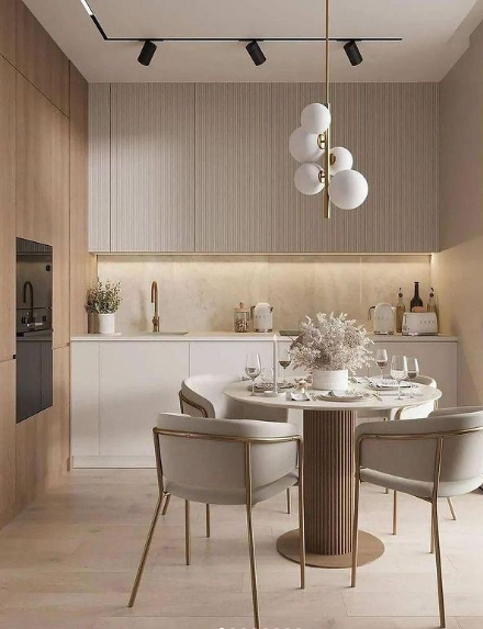 The dining area complements the look with a round table and upholstered chairs, set against a backdrop of sleek cabinetry and warm wood tones.