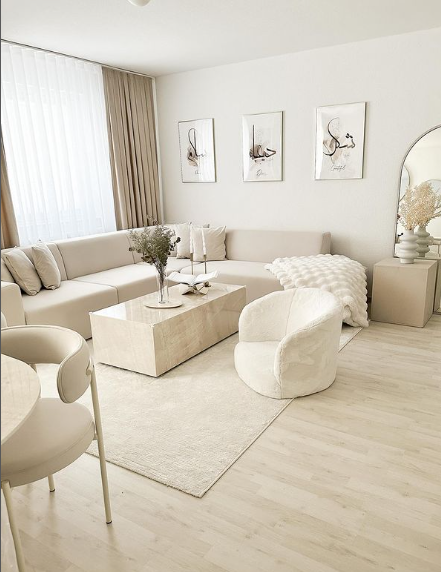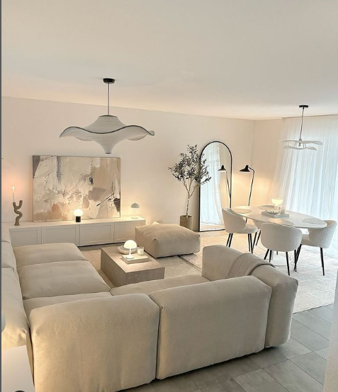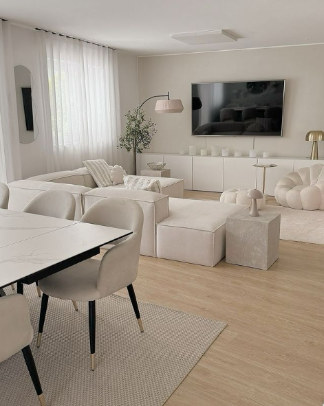 25. Soft and Inviting Monochrome Living-Dining Space