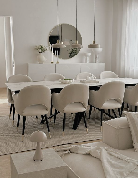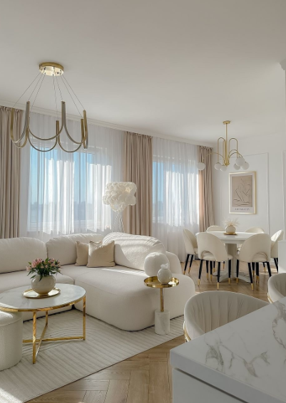 This stunning living and dining combo radiates elegance with its soft, neutral palette and luxurious gold accents.