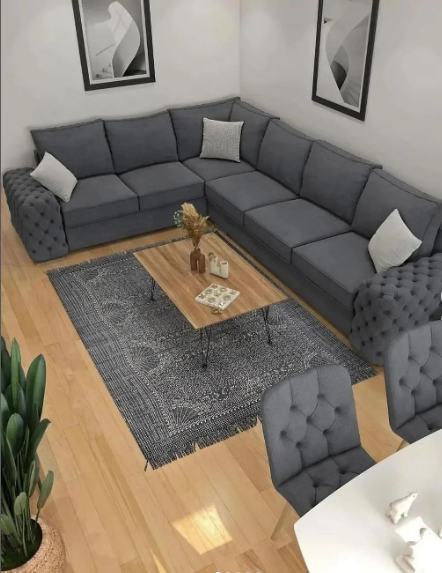 This compact living and dining setup maximizes space with a plush, deep gray sectional that defines the cozy living area.