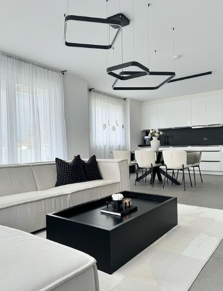 The living area features a light-toned sofa paired with bold black cushions and a striking black coffee table, creating a dramatic contrast.