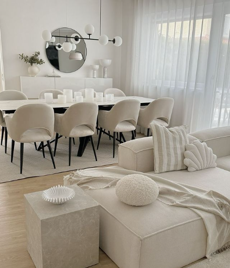 This minimalist living and dining combo exudes calm and sophistication with its monochromatic palette of soft whites and creams.