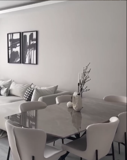 This chic living and dining combo combines minimalist design with subtle elegance.