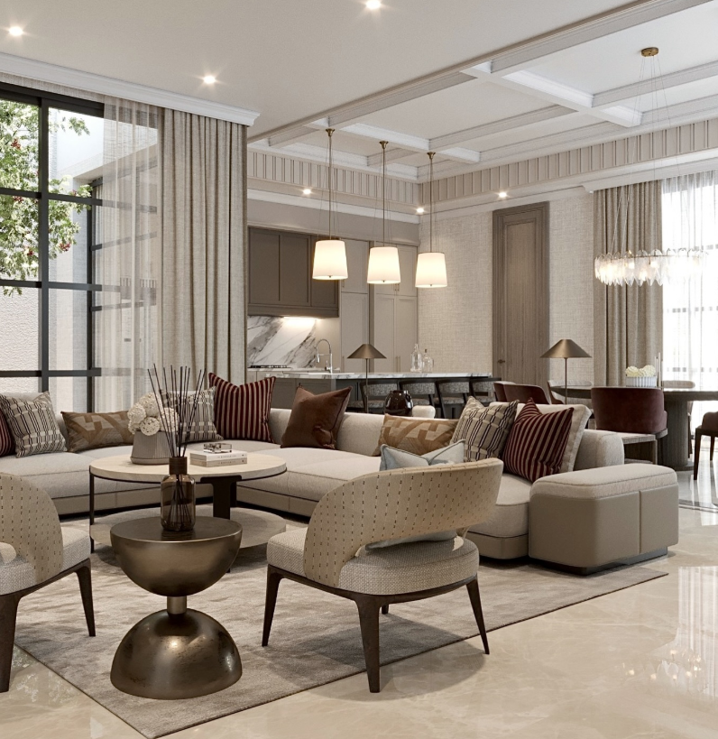 Soft beige and cream tones flow throughout the space, from the plush armchairs and ottoman to the elegant dining set, blending comfort with style.