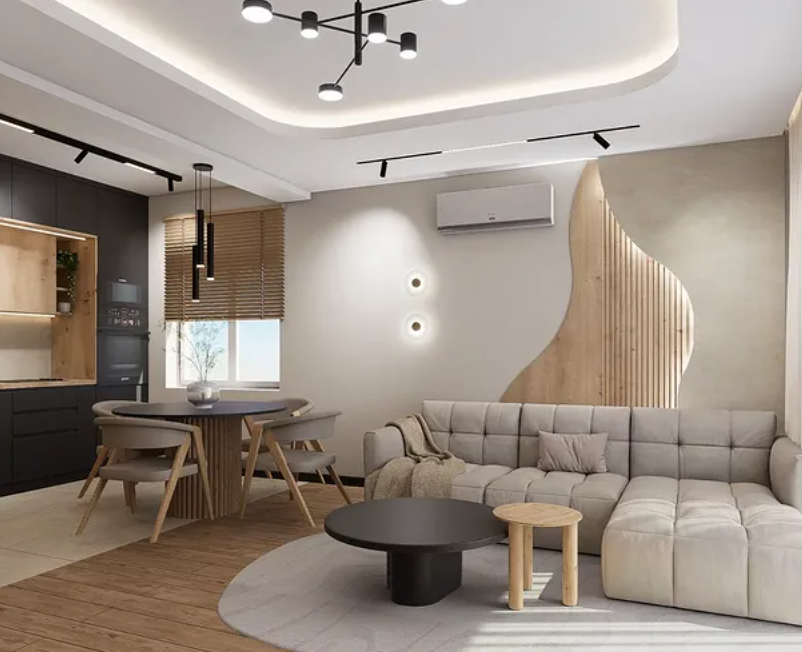 This modern small-space layout is proof that size doesn’t limit style. The curved wood accent wall adds visual interest, while the neutral palette keeps the room calm and cohesive.