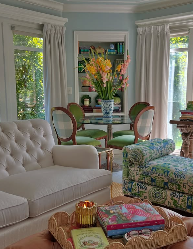 The mix of floral upholstery, green gingham chairs, and blooming centerpiece creates a garden-room feel, while layered books and wicker textures add warmth.