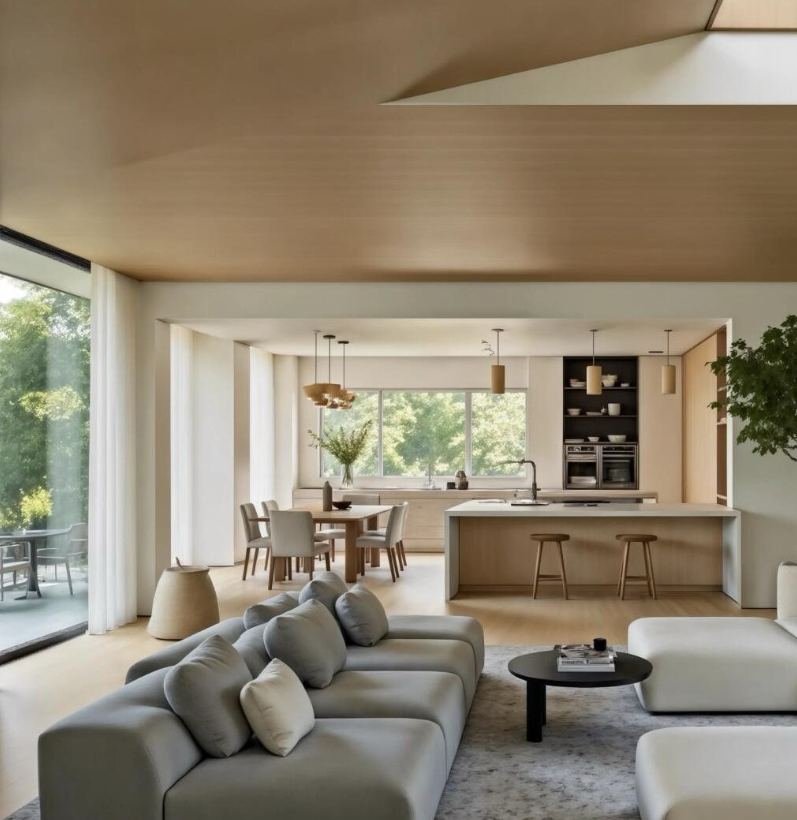 This open-concept living and dining area showcases sophisticated minimalism with a neutral color palette and clean lines.